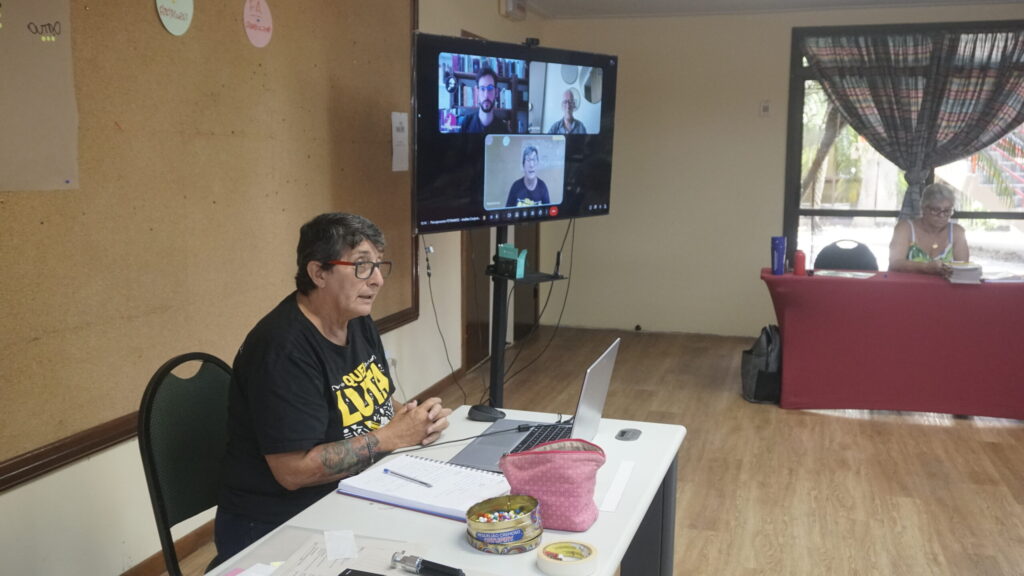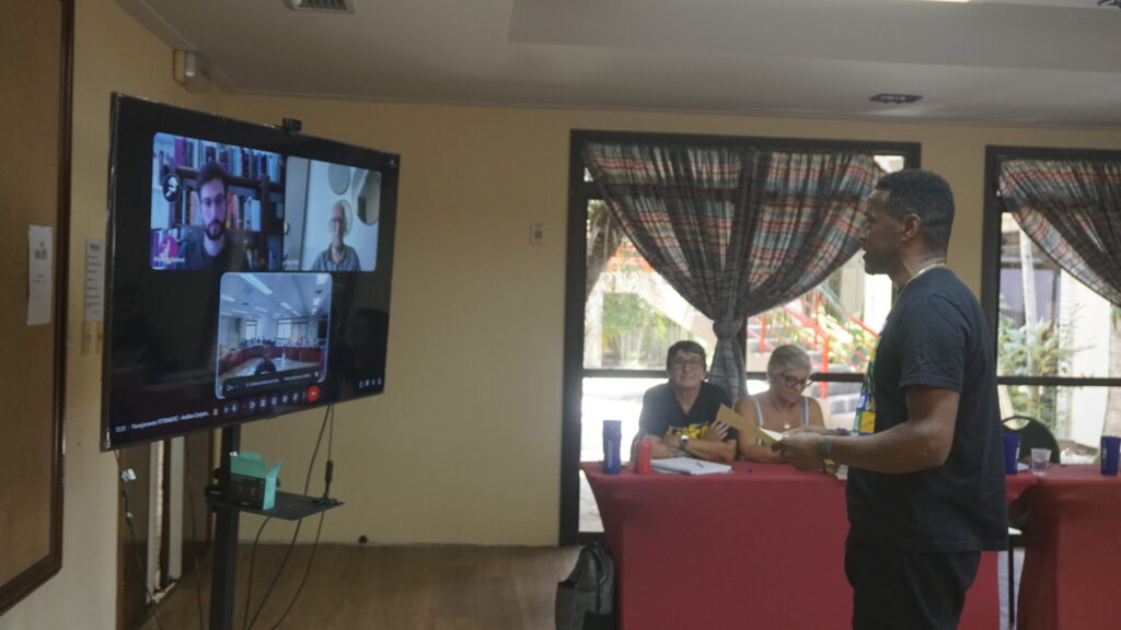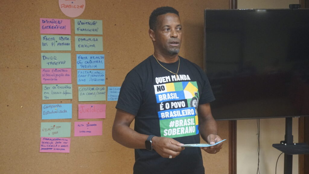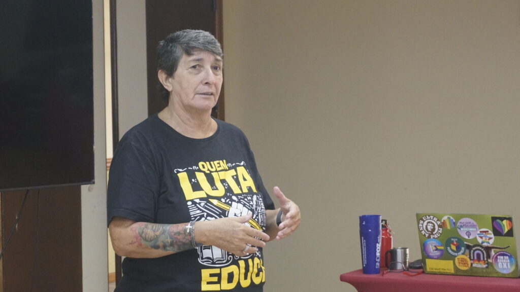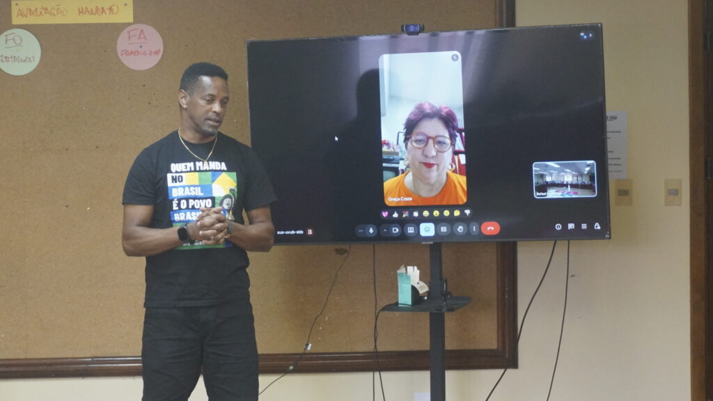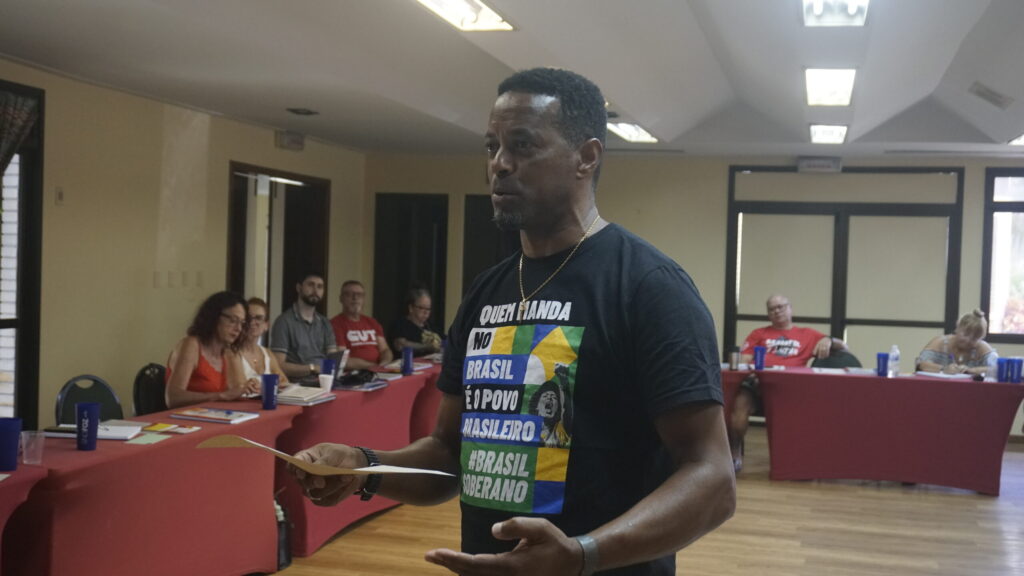 Euan apresentou um panorama da realidade sindical no cenário global, abordando os ataques sistemáticos aos direitos trabalhistas em vários países e os impactos das reformas que têm enfraquecido a organização sindical. Ele reforçou que, em momentos de maior ofensiva, cresce a importância do trabalho de base e da sindicalização.