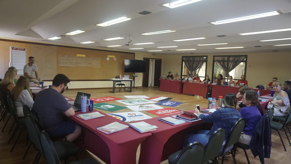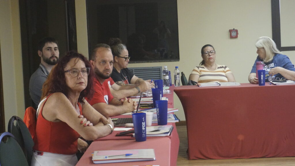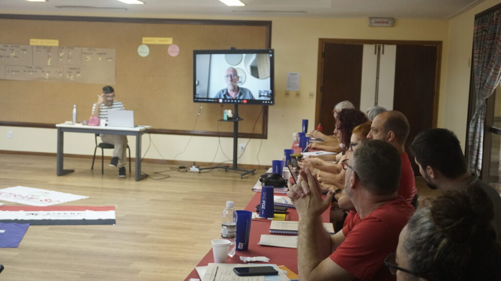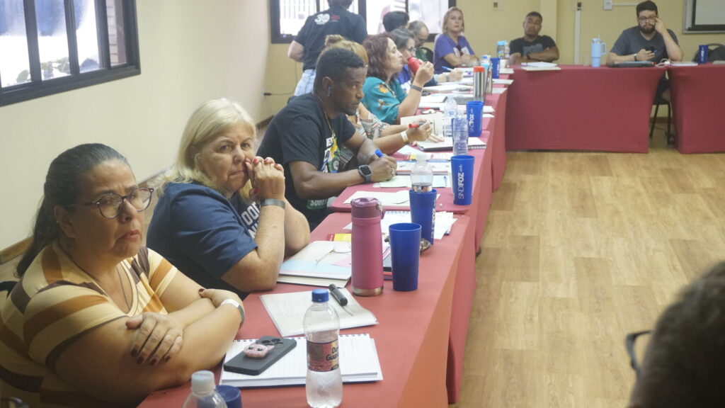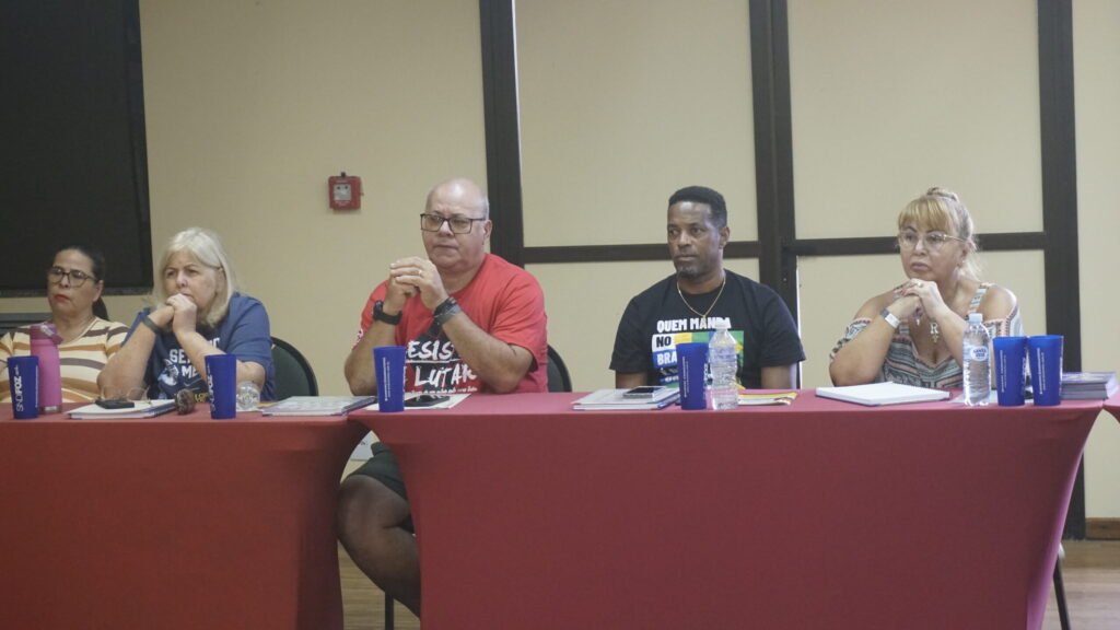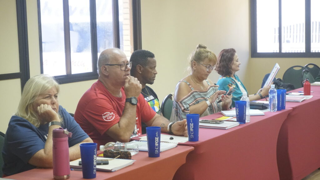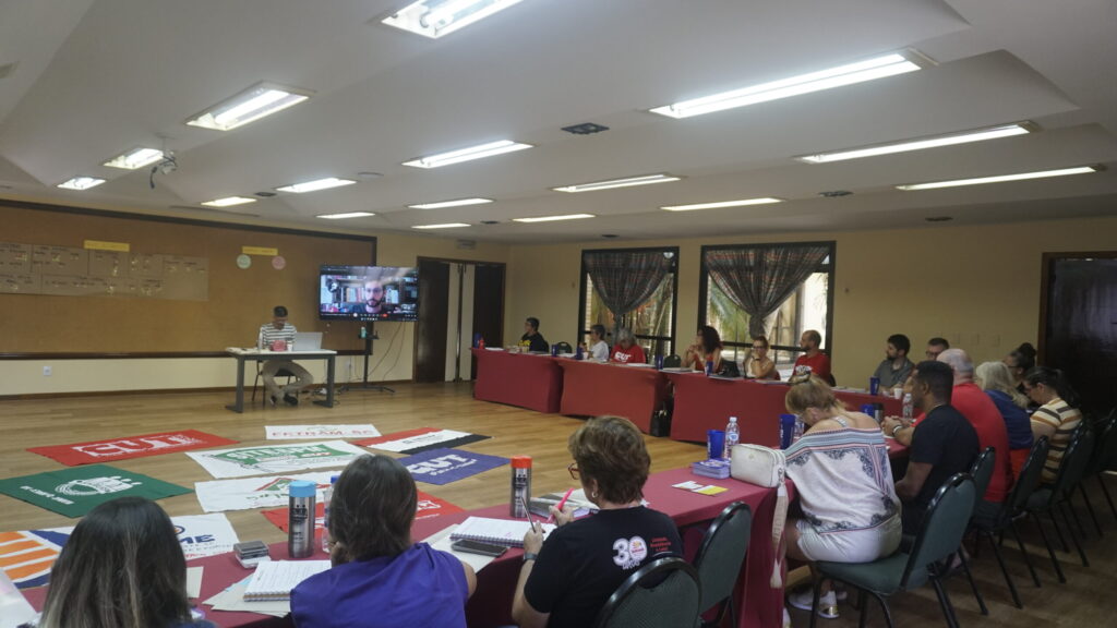Durante a manhã, os dirigentes participaram de uma ampla análise de conjuntura com contribuições do secretário regional da ISP Interamérica, Euan Gibb, e do economista Maurício Mulinari.