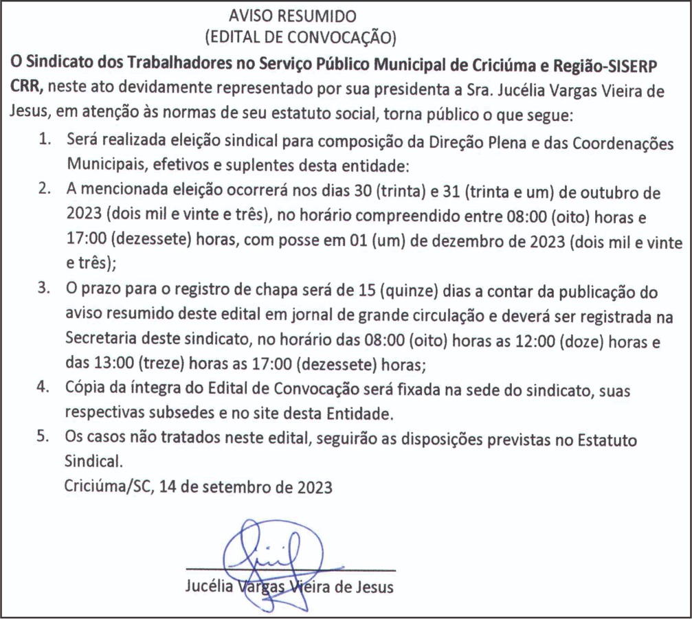As eleições que vão acontecer nos dias 30 e 31 de outubro, vai definir a nova direção do sindicato que vai representar os(as) servidores(as) públicos(as) de Criciúma, Nova Veneza, Siderópolis, Treviso, Urussanga e Cocal do Sul. O mandato tem duração de 4 anos. O horário de votação será das 8h às 17h, sem fechar no intervalo do almoço. Para votar é necessário apresentar seu documento com foto.